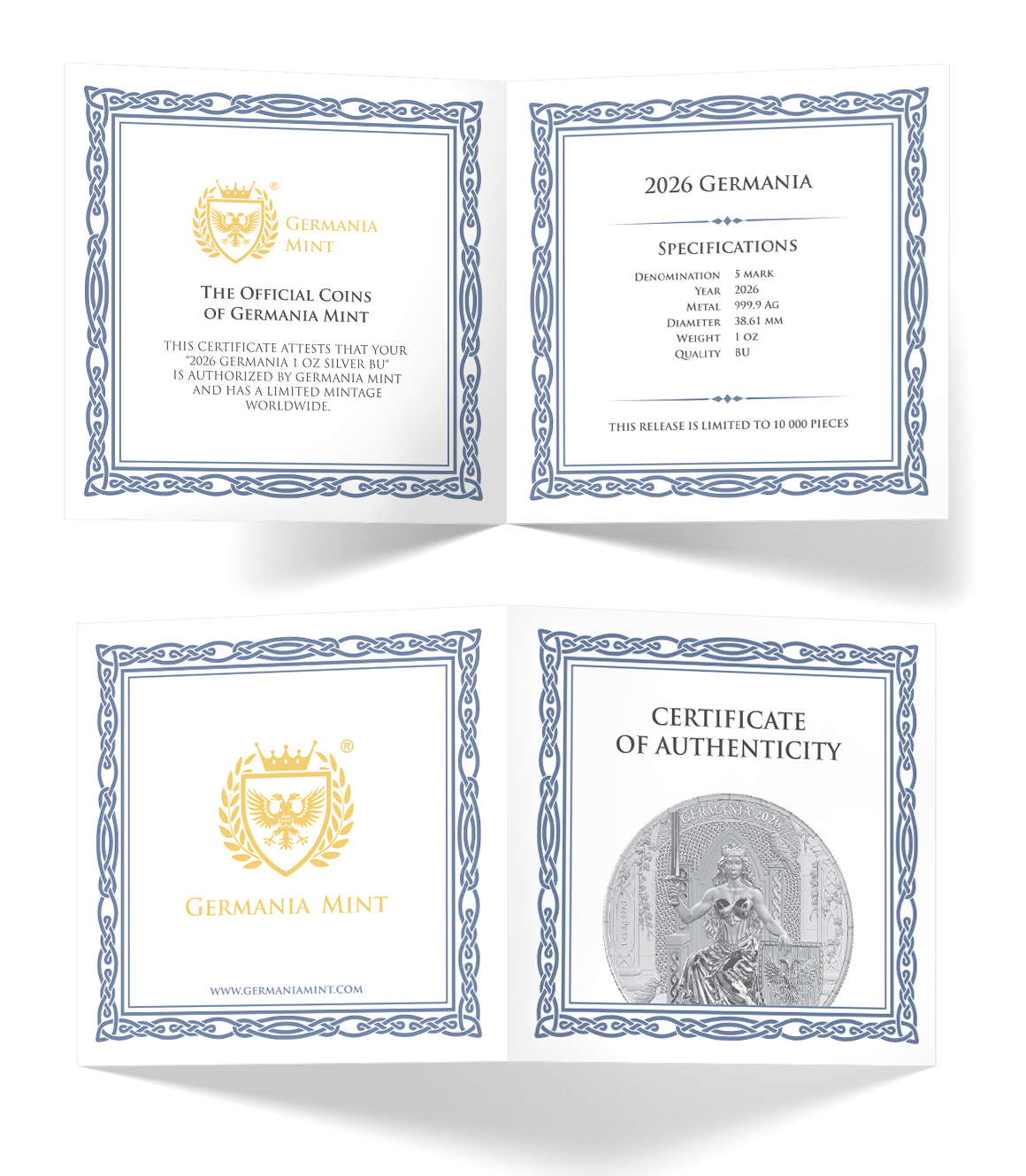 Silbermünze 1 oz Germania Mint Germania 2026 BU 5 Mark mit Zertifikat