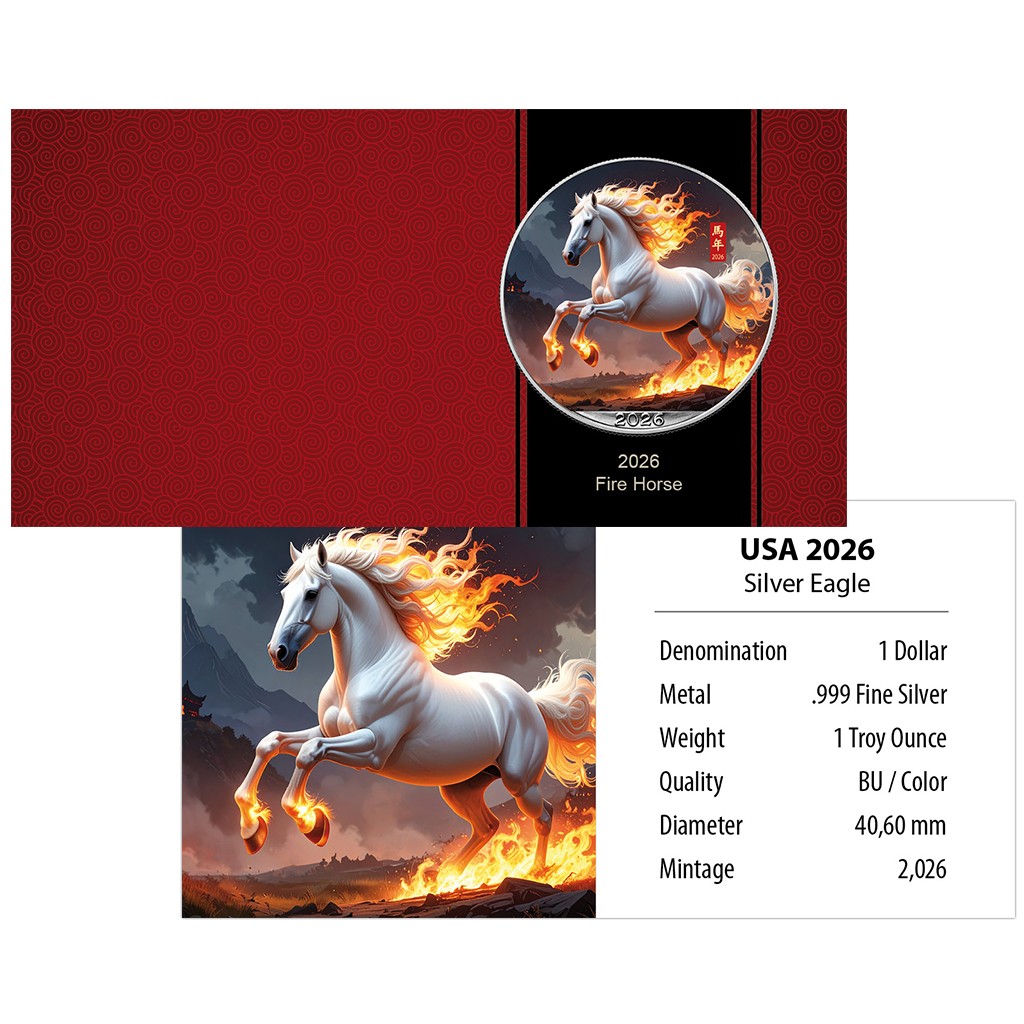 Silbermünze 1 oz Silver Eagle 2026 – Fire Horse – Farbe 999 Silber BU USA