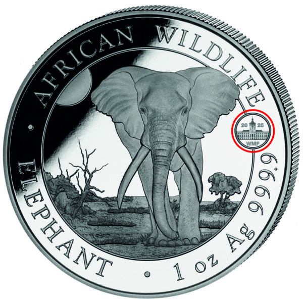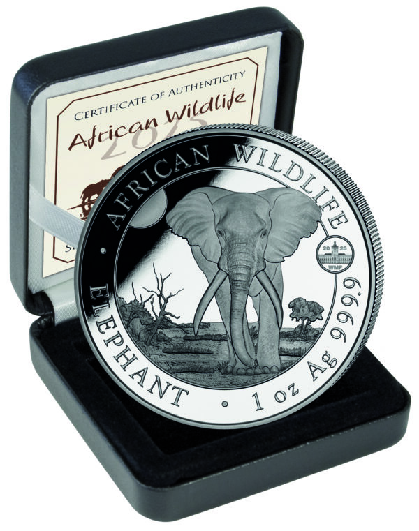 Silbermünze 1 oz Somalia Elefant 2025 Privy Mark WMF Berlin Box Zertifikat BU