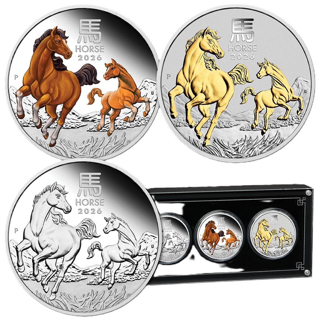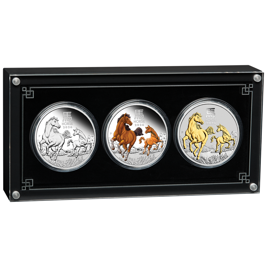 Silbermünzen Set 3 x 1 oz Lunar III Jahr des Pferdes 2026 Farbe PP Silbermünze